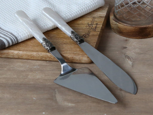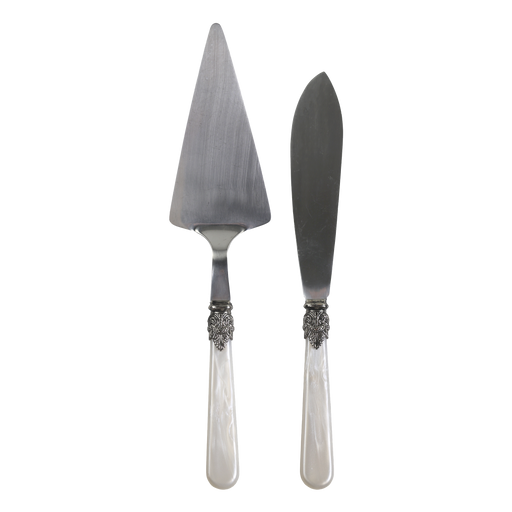 Dásamlega falleg hnífapör með skrauti sem koma nú í nýjum lit Perlu hvítum koma í settum fyrir fjóra Einnig hægt að fá kökuspaða og kökuhníf í sam...