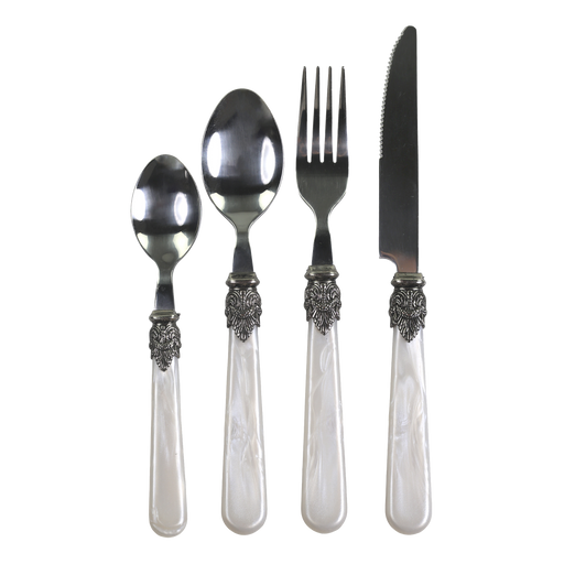 Dásamlega falleg hnífapör með skrauti sem koma nú í nýjum lit Perlu hvítum koma í settum fyrir fjóra Einnig hægt að fá kökuspaða og kökuhníf í sam...